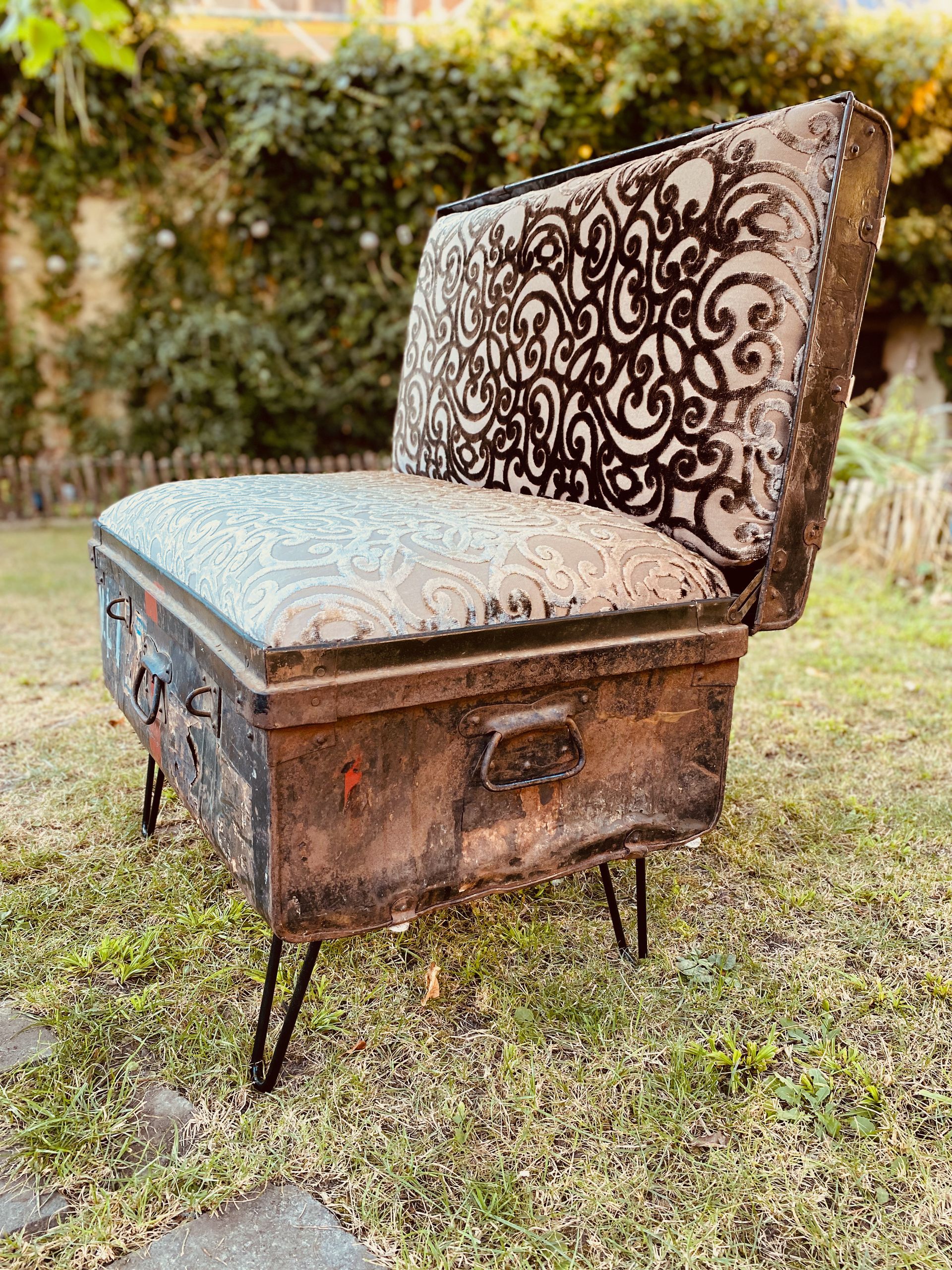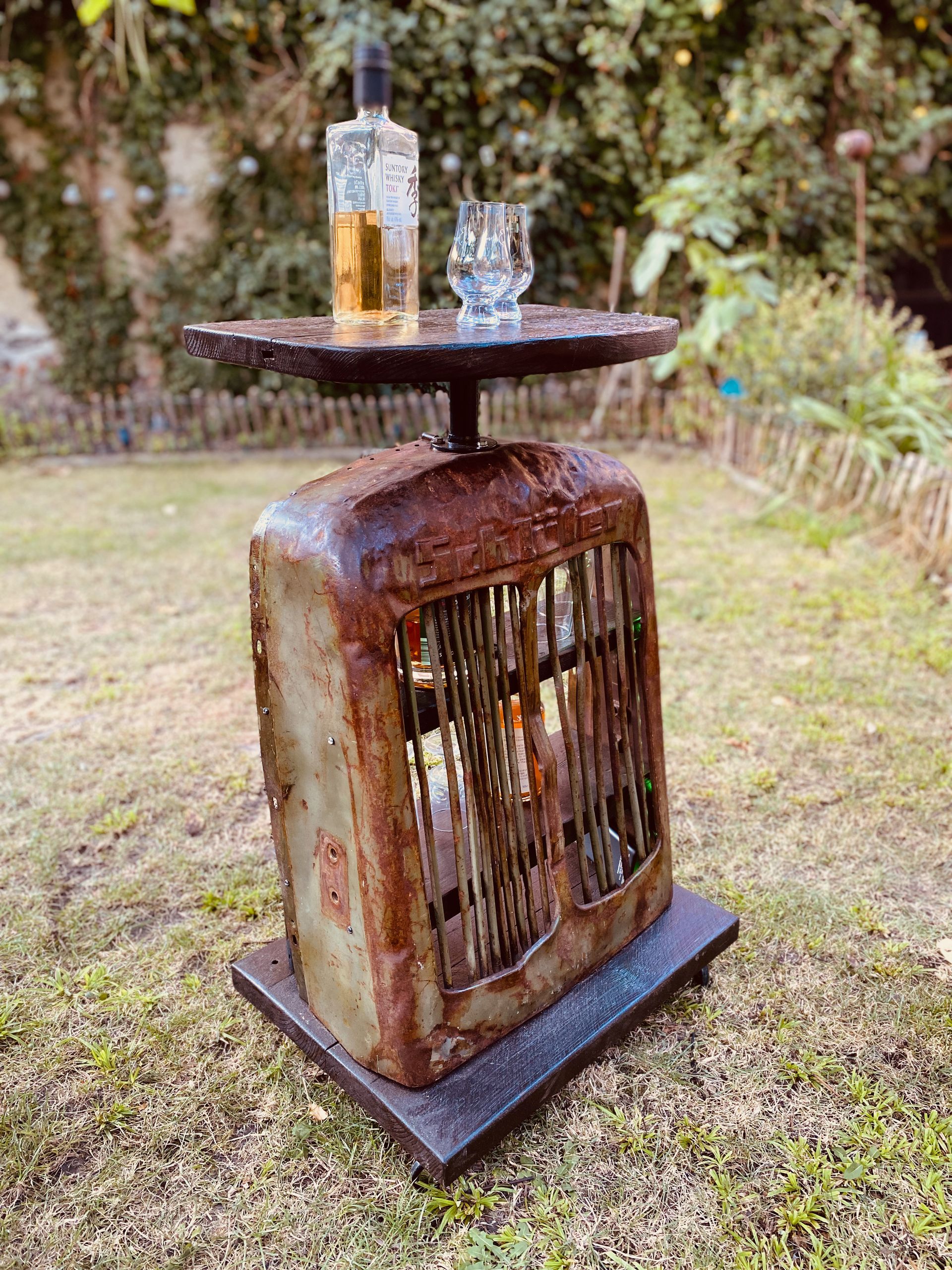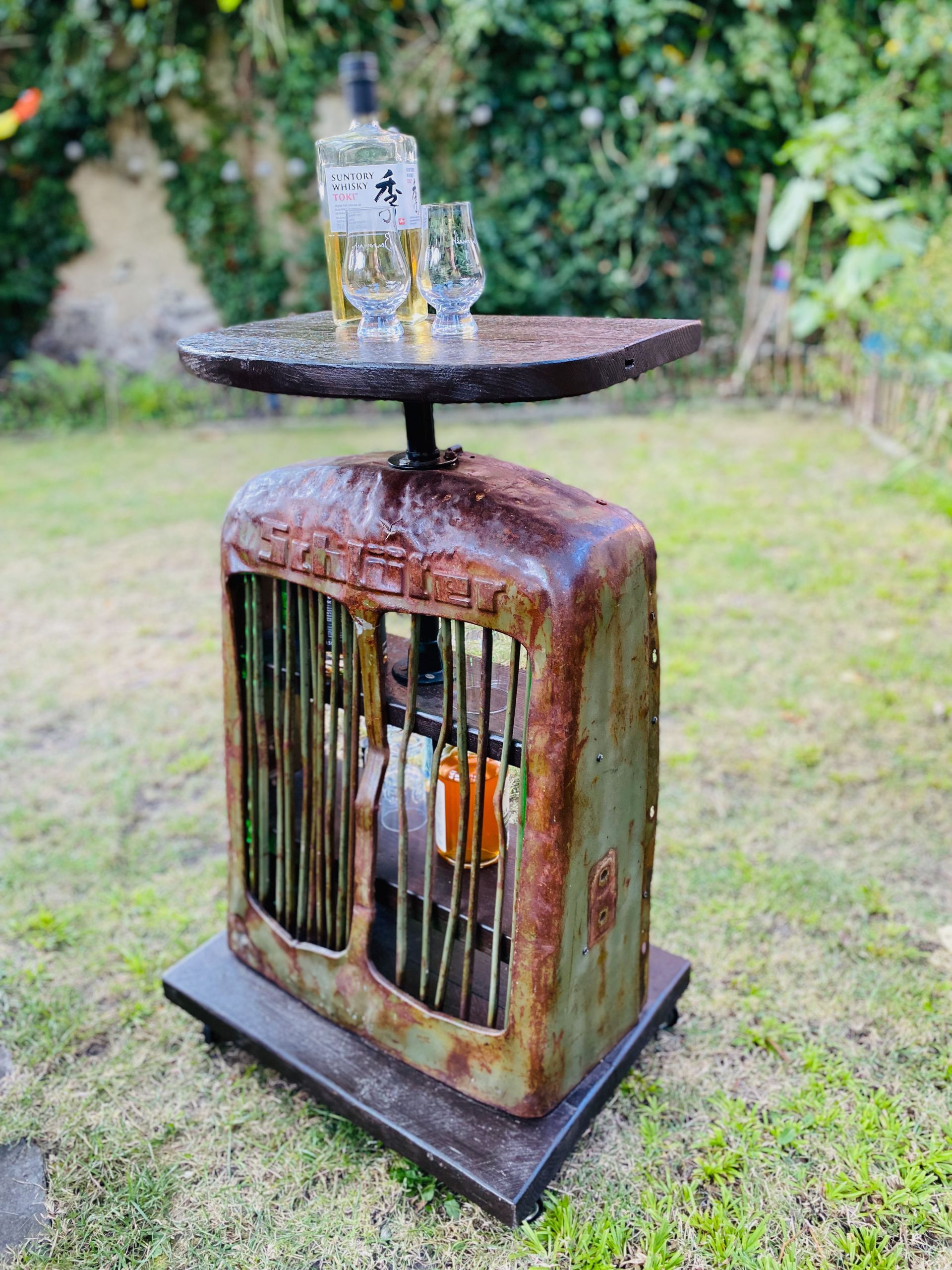 Bevorzugt verwende ich ausgediente Technikteile aus Metall und altes Holz. Die Spuren der Zeit hinterlassen ihre Geschichte auf dem Material und sollen nicht entfernt werden. Die Patina bleibt bewusst sichtbar und trägt zum Charakter bei.
